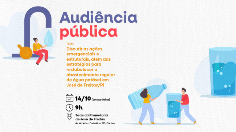 O Ministério Público do Piauí (MPPI), por meio do promotor de Justiça Ricardo Lúcio Freire Trigueiro, titular da Promotoria de Justiça de José de Freitas, convida a participar da audiência pública, todos os cidadãos, sociedade civil organizada, o chefe do poder executivo e legislativo municipal, e representantes da Empresa Águas do Piauí, a fim de discutir metas, prazos e estratégias para o restabelecimento regular, contínuo e seguro do fornecimento de água potável no município de José de Freitas. A audiência acontecerá no auditório da sede da Promotoria de José de Freitas, na Avenida Américo Celestino, 313, Centro.