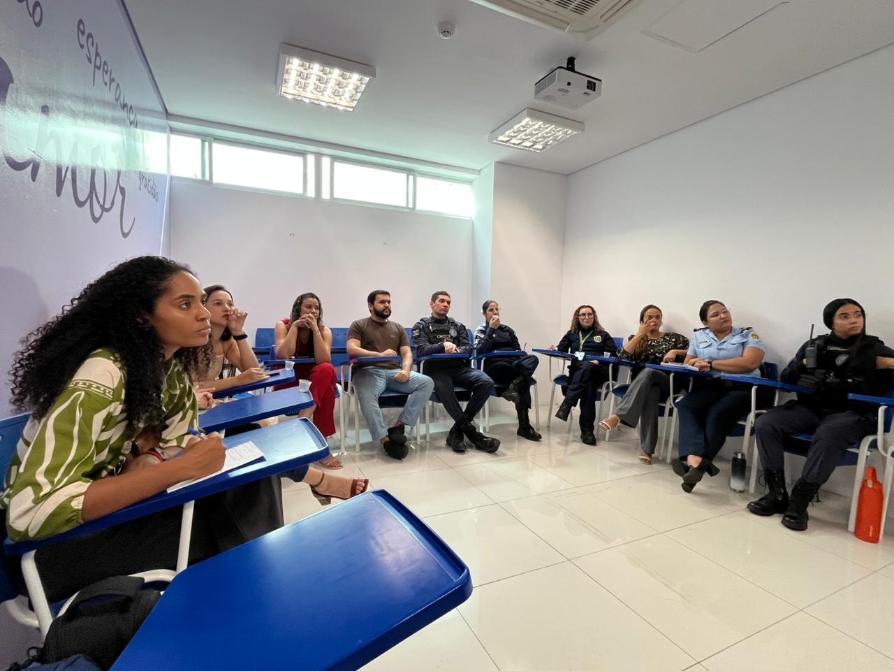 A formação foi conduzida pela psicóloga Cynara Veras, integrante do Núcleo das Promotorias de Justiça de Defesa da Mulher Vítima de Violência Doméstica e Familiar, e contou com a presença da promotora de Justiça Amparo Paz, coordenadora do núcleo, além da equipe da Guarda Municipal.