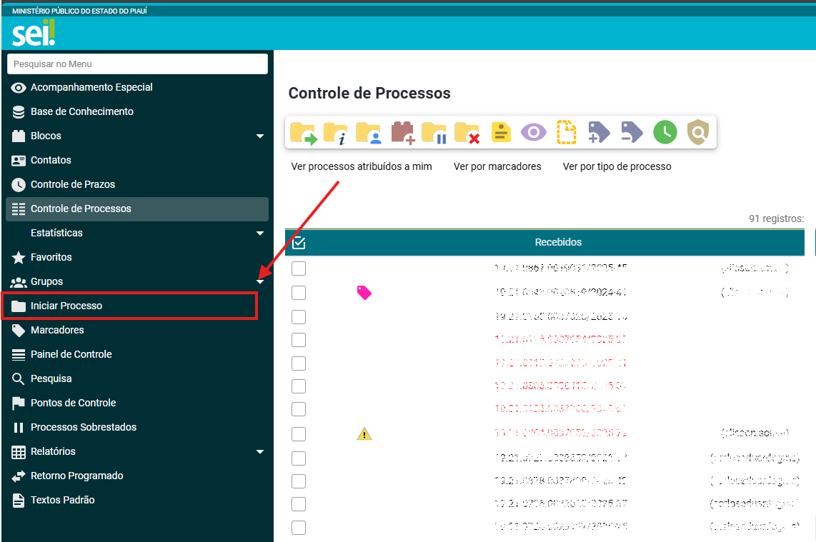 No menu do SEI, localizado à esquerda da página do sistema, clique em “Iniciar Processo”.