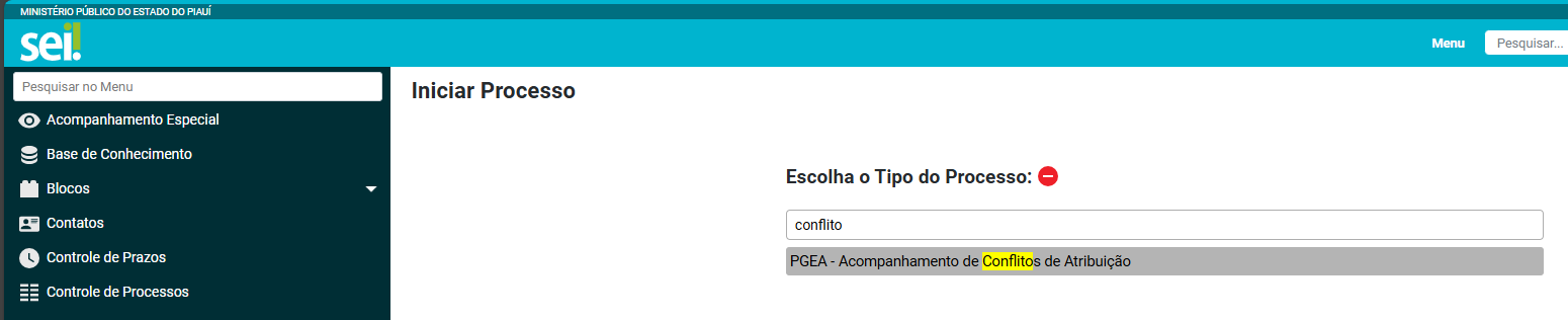 Procure pelo tipo de processo “PGEA – Acompanhamento de Conflitos de Atribuição” e o selecione.
