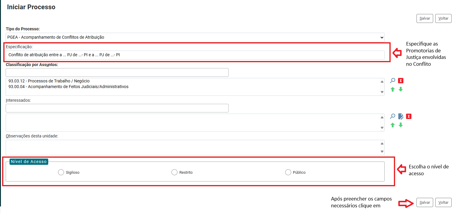 Especifique as Promotorias de Justiça envolvidas no conflito e selecione o nível de acesso do processo. Caso o processo não se enquadre em nenhuma das hipóteses do art. 13 do Ato PGJ nº 1.058/2021, o processo deverá ser colocado no nível de acesso público.