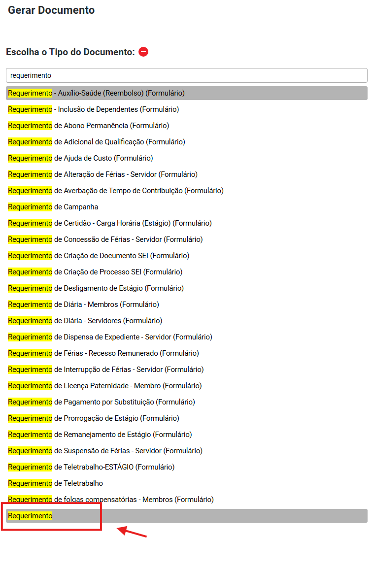 No campo “Gerar documento”, escolha o tipo de documento “Requerimento”.