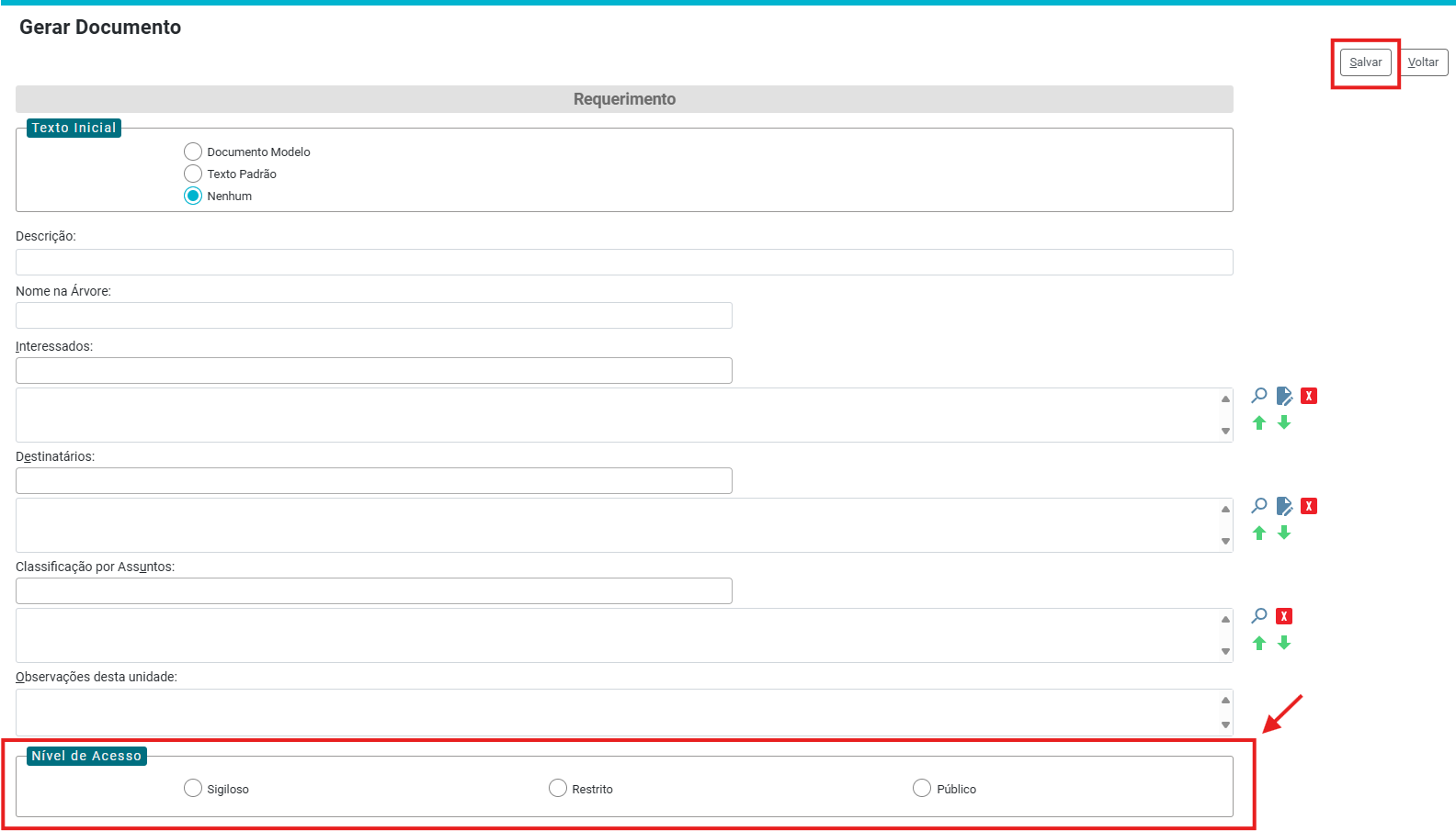 Selecione o nível de acesso do documento e clique em “Salvar”.