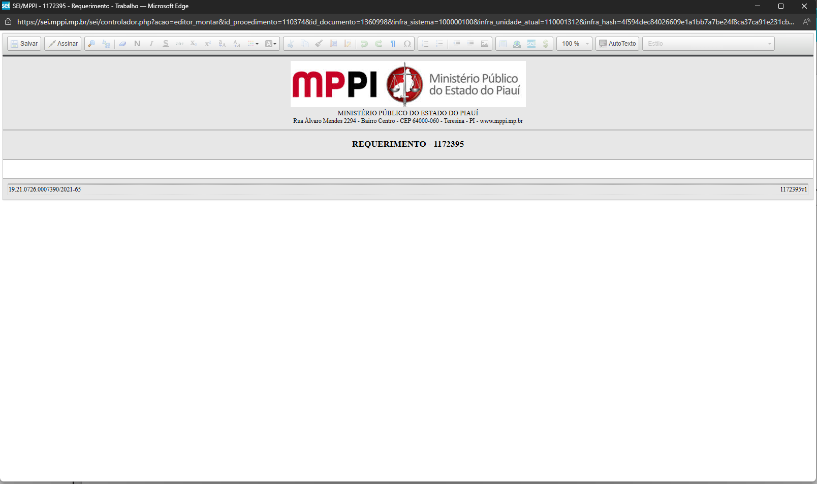 Uma página de edição será aberta para que você redija a sua Suscitação de conflito de atribuição. Após redigir, o documento deverá ser assinado. Documentos não assinados não podem ser vistos por outras unidades.